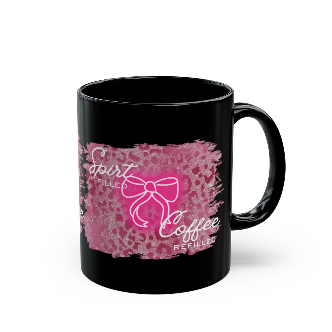 Black Coffee Mug — “Spirit Filled, Coffee Refilled” Pink Bow Design (11oz & 15oz)