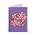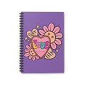 A cheerful spiral notebook that brings bright, hand-drawn charm to everyday notes. The front cover features playful hearts and daisies around a colorful "LOVE" emblem with a small scripture accent, set against a warm purple background. Inside are 118 ruled pages on smooth 90gsm paper that invite writing, journaling, and reflection. A metal spiral lets the pages lie flat or fold back for easy writing, and the inner back cover pocket keeps receipts, notes, or loose ephemera organized. Compact at 6" x 8", it slips into tote bags and backpacks for quick access when inspiration strikes.
